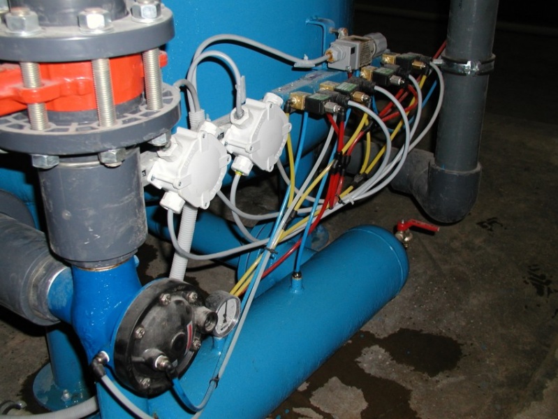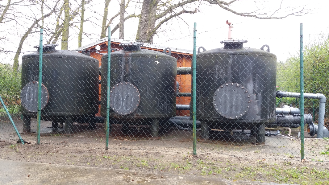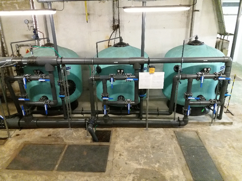 Výměna tří kusů pískových, laminátových filtrů o průměru 1.800 mm včetně náplně. Součástí demontáž a likvidace starých filtrů, úprava rozvodů vody od cirkulačních čerpadel až po samotné pískové filtry.