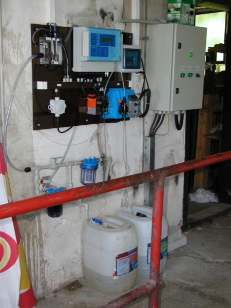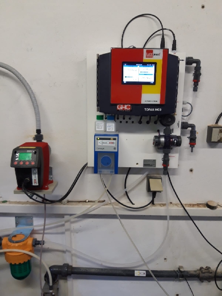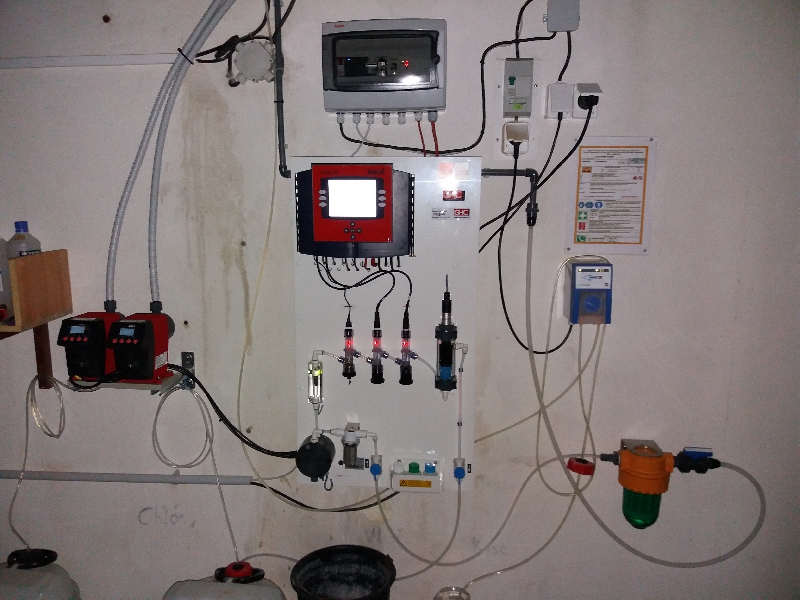 Dodávka a instalace automatické měřicí, regulační a dávkovací techniky (Deska MaR) s dávkovacími čerpadly na dávkování media pro úpravu pH. K úpravě vody se používá plynný chlor, solenoidový ventil zajišťuje "ovládání" chlorové vody v potrubí.