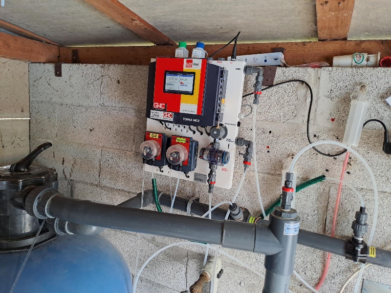 Dodávka a montáž měřiče a regulátoru pro dávkování chloru, úpravu pH a redox potenciálu včetně vločkovače pro koupelový bazén s objemem 10 m3. Dodáno spolu se středotlakou UV lampou s automatickým stěračem.